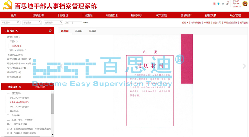 干部人事檔案綜合管理系統(tǒng)是一款功能強(qiáng)大的人事檔案管理軟件,主要針對(duì)黨員、干部、職工的人事檔案信息進(jìn)行采集、管理、專項(xiàng)審核工作,支持檔案掃描、統(tǒng)計(jì)打印、表單方式著錄、據(jù)字典管理、資料庫(kù)管理等功能。實(shí)現(xiàn)干部檔案的長(zhǎng)期安全存放、日常干部檔案管理、檔案查詢利用維護(hù)等,優(yōu)化干部檔案查借閱流程,提高干部數(shù)字檔案的利用率。