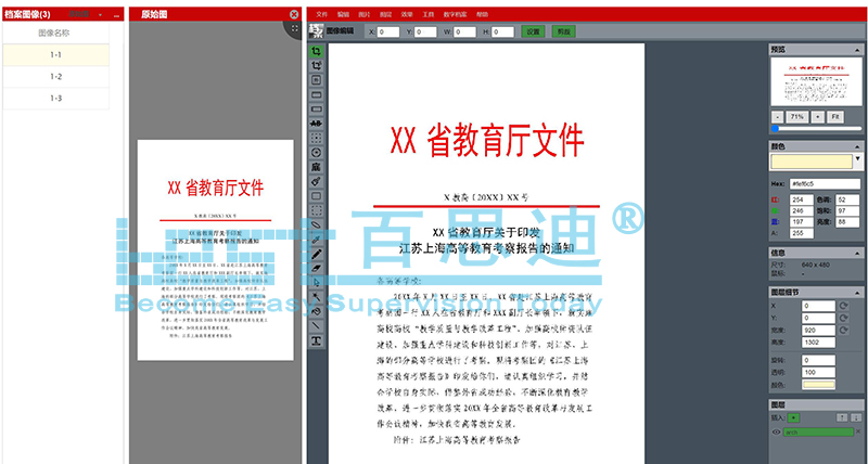 6、人工智能批處理圖像,自動(dòng)旋轉(zhuǎn)、剪裁、高清白、高清黃圖像處理、去污去孔處理、印章加深、顏色加深等工具;修改底色、批量高清等功能。