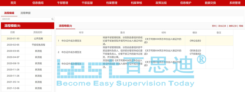 任免流程模板管理。針對(duì)不同任免類型,按照規(guī)定的流程換屆進(jìn)行模板化管理,實(shí)現(xiàn)模板的新建、編輯、刪除、查詢等功能。支持任免過(guò)程中的模板動(dòng)態(tài)修改,記錄修改情況。流程維護(hù)、任免材料電子化管理、材料上傳、材料維護(hù)、材料查詢、材料調(diào)用、任免工作紀(jì)實(shí)管理等。
